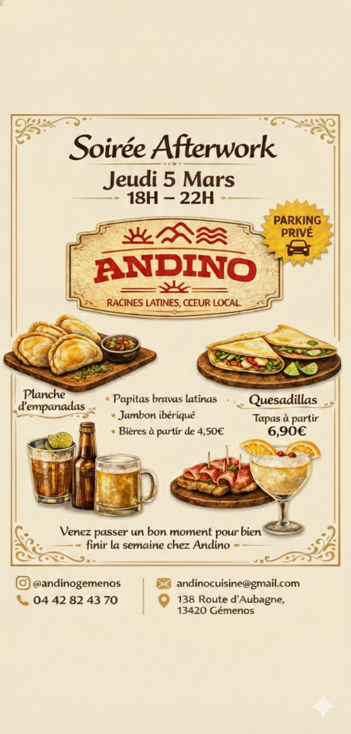 Venez découvrir Andino, votre adresse gourmande de proximité à Gémenos. Entre restauration rapide le midi et service traiteur le soir, notre concept flexible s'adapte à vos envies tout en mettant l'accent sur la fraîcheur, la qualité et les saveurs d'Amérique latine.